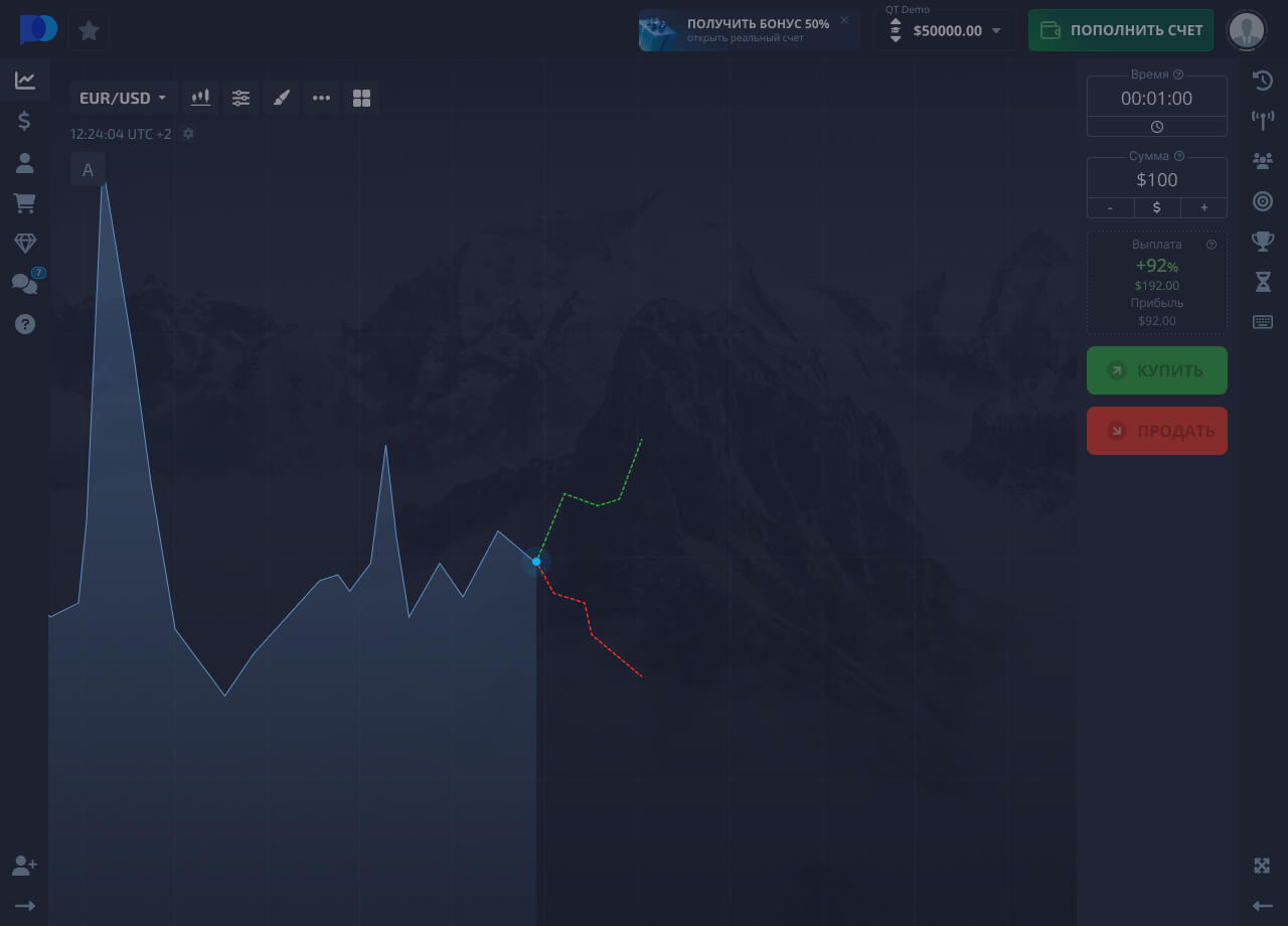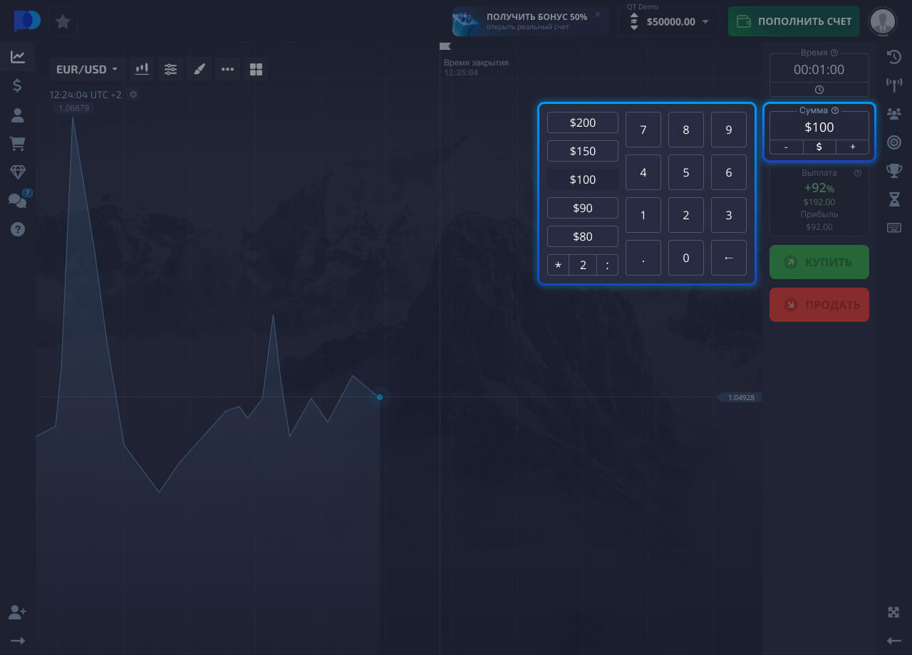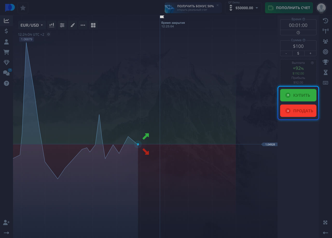 Нажмите кнопку "Купить" или "Продать", если вы считаете, что цена актива будет расти или, соответственно, падать.