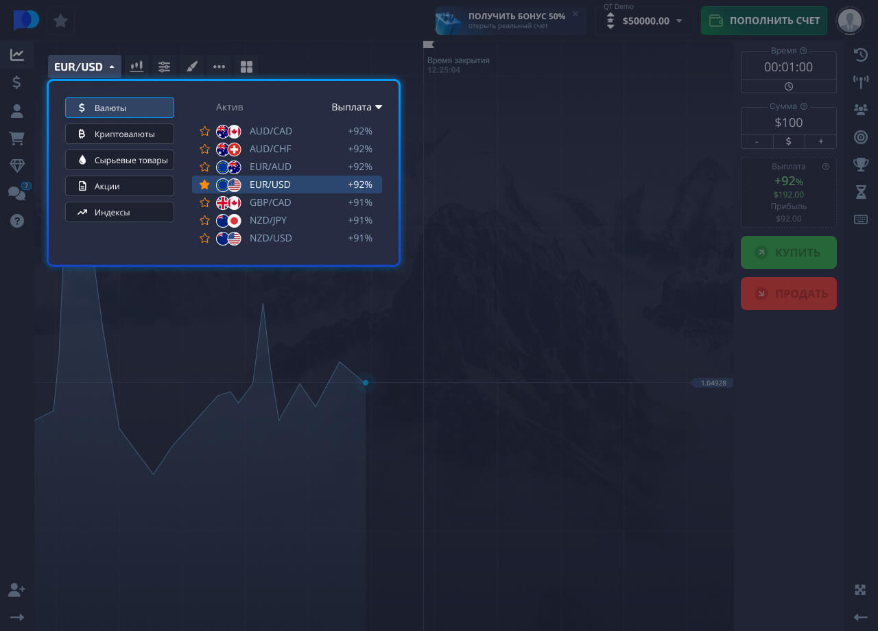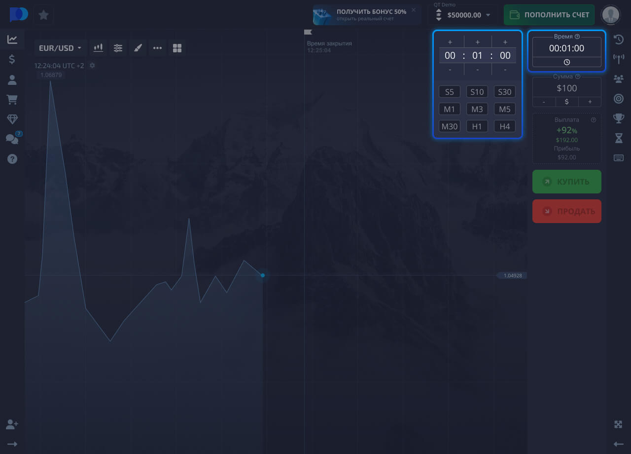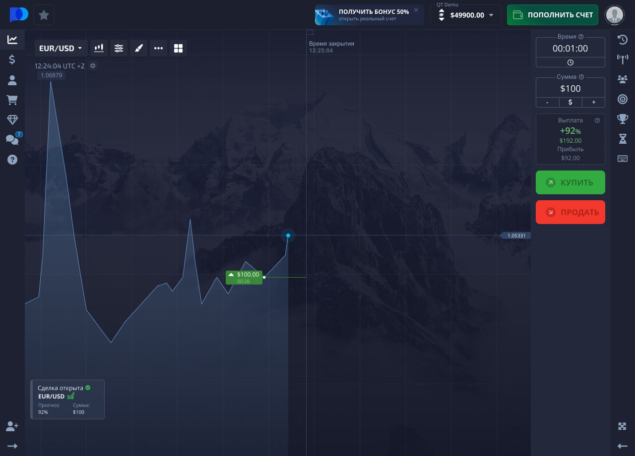 Нажмите кнопку "Купить" или "Продать", если вы считаете, что цена актива будет расти или, соответственно, падать.