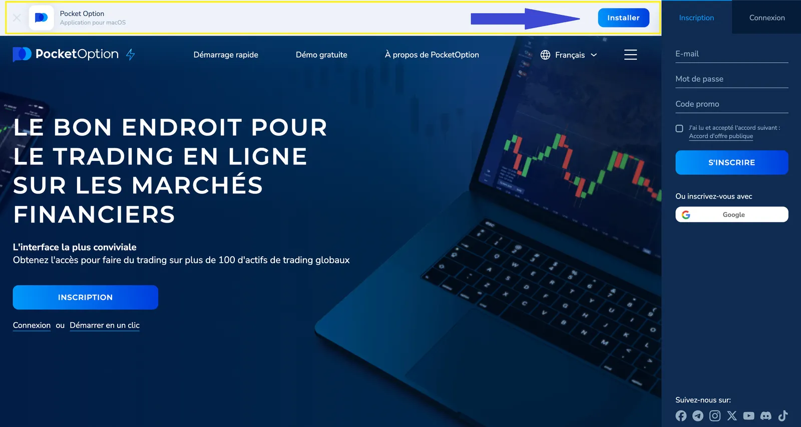 Accédez au site officiel de Pocket Option, choisissez la version pour PC et suivez les instructions selon votre système (Windows ou Mac). Important : vérifiez que votre courtier est régulé par l'AMF et déclarez vos gains selon la fiscalité française (30% sur les plus-values mobilières).