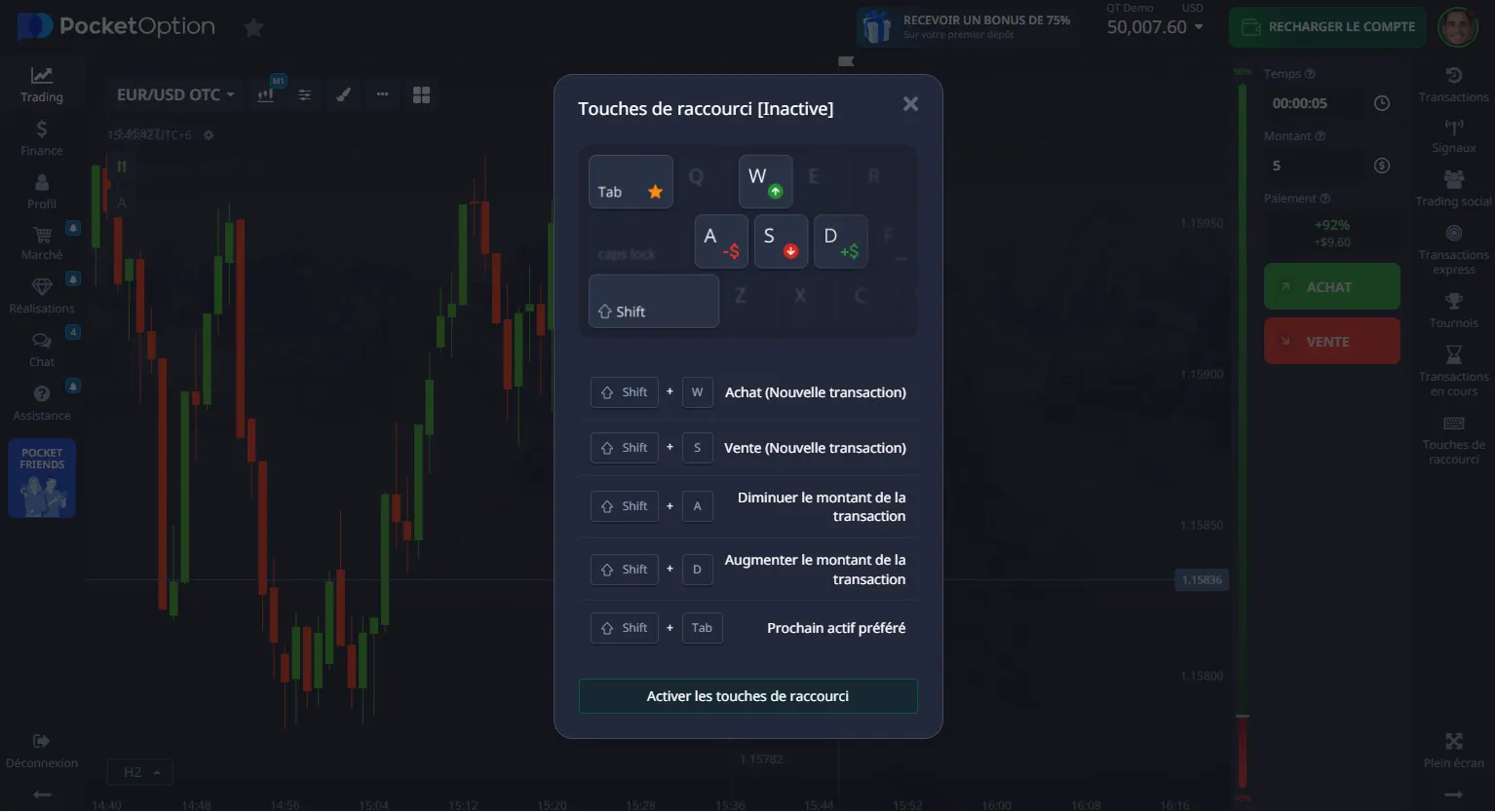- Configurer les raccourcis clavier : Pour accélérer les opérations de trading, vous pouvez définir des raccourcis clavier pour ouvrir/fermer des trades, changer les montants d’investissement, et plus. Ceci est particulièrement utile pour les scalpers et day traders, où chaque seconde compte.