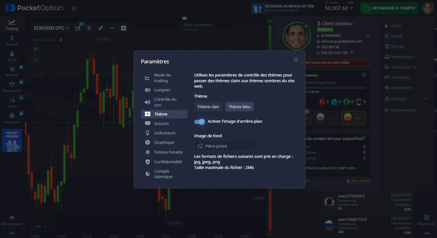 L’application Pocket Option pour PC vous permet de personnaliser complètement votre espace de travail selon vos préférences personnelles. C’est un avantage majeur par rapport aux versions web, où les options de personnalisation sont limitées. Vous pouvez :