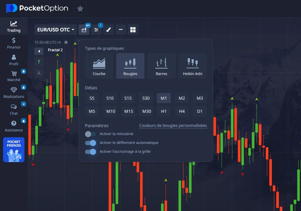 - Dans Pocket Option, ouvrez un actif et sélectionnez un timeframe